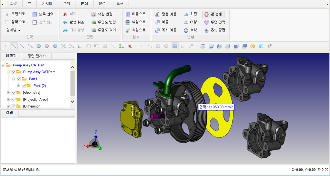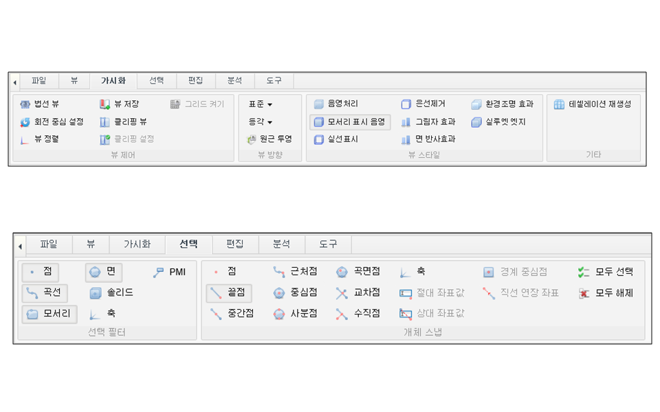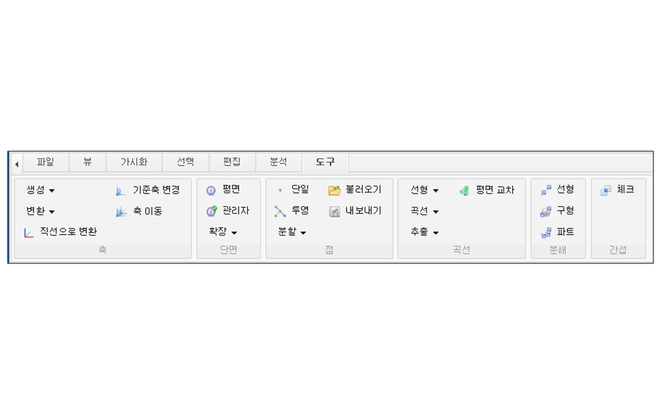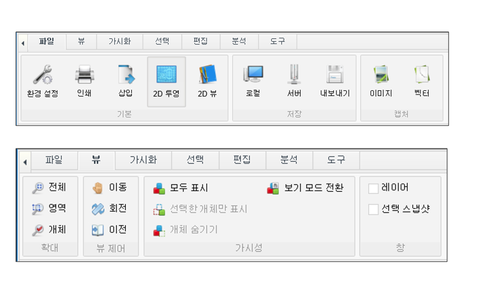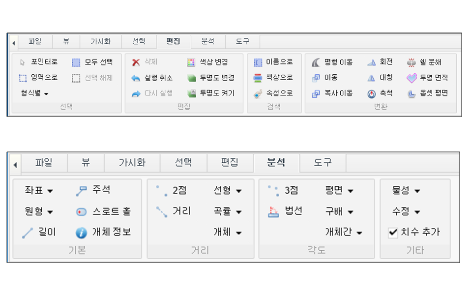 메뉴는 OPR3D 기능과 동일하며, 파일, 뷰, 가시화, 선택, 편집, 분석, 도구, 2D 등 메뉴로 구성되어 있습니다.