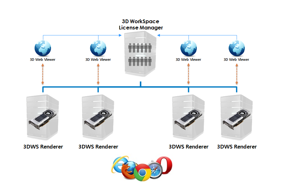 1대의 Server로 모든 기능 수행이 가능하며, 사용자 수가 많은 경우 각각의 기능을 수행하는 서버를 다중으로 구성할 수 있습니다. 즉, 사용량에 따라서, 컨버터나 랜더러 서버를 추가하여 성능 향상이 가능합니다. 또한 라이선스 매니저 서버에서 각각의 서버로 분산 처리 가능하며, 다중 구성 시 각각의 서버의 CPU 사용량에 따라 여유 있는 서버에 접속 분배 가능합니다.